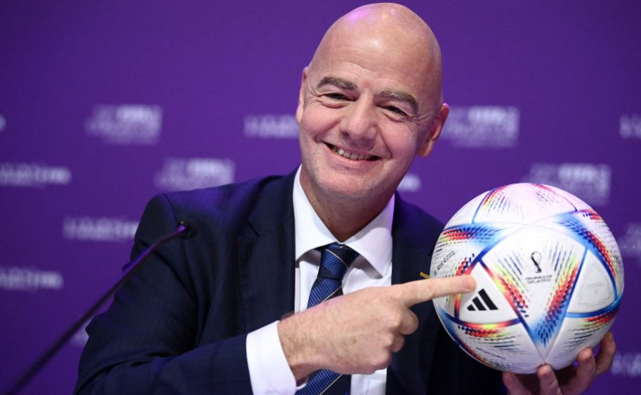 TOPSHOT – FIFA president Gianni Infantino poses with Al Rihla, the official match ball before a press conference during the 72th FIFA Congress in the Qatari capital Doha, on March 31, 2022. – The countdown towards the most controversial World Cup in history really begins tomorrow as the draw for Qatar 2022 takes place in Doha 2022, less than eight months befor the start of the tournament itself. (Photo by FRANCK FIFE / AFP)